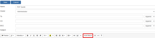 The To, CC, and BCC fields enable you to set default email addresses for specific templates. This is very useful if you want the sales manager BCC'd on every quote that goes out or maybe you need purchasing automatically CC'd when you are sending a payment request email. This feature makes it very easy to automatically default email addresses for specific email templates in your installation. You can also utilize macros in these fields.