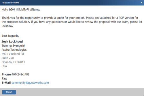 You can preview what the template will look like with the macros populated from the QuoteWerks system by clicking on the Preview button. This opens the Template Preview window.