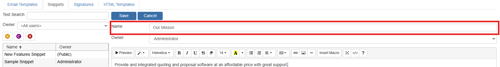 You are able to change the owner by selecting the drop-downown menu below of the Snippet name. You will also now be able to save the Snippet and any changes by clicking on the save.