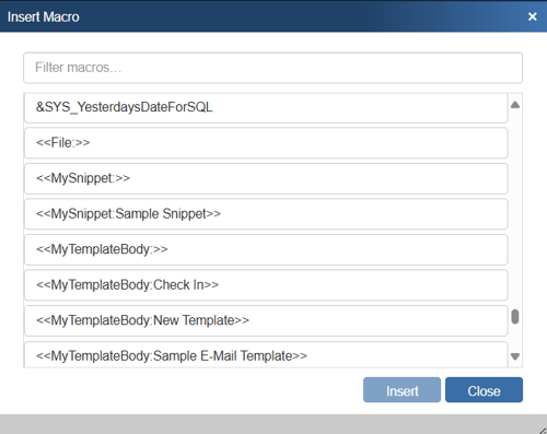 To use a created Snippet in an email template, open the email template you wish to add a snippet to. After clicking on the Macro button look for the “MySnippet” and/or “Public Snippet” macro: