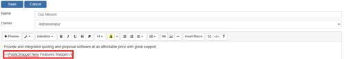 The next section of the Snippet window will allow you to customize the template. The window has a full toolbar that includes the ability to change fonts, sizes, cut, copy, paste, spell check, etc. You can also insert pictures and web links. Users also have the ability to switch the Snippet into HTML code as well.