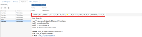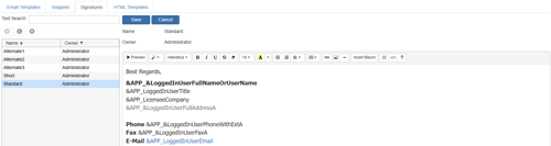 The Standard Signature is the signature you use for the majority of your correspondence. This signature typically has all of your company contact information as well as your contact information contained in the email and any other information you wish to include. The Email signature macro for the Standard Signature is <<SignatureStandard>>. Using this macro in an email template will activate that signature for that template rather than the signature selected as active.