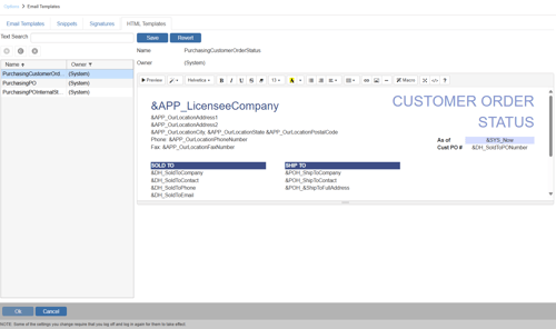 The HTML templates tab contains templates used for purchasing emails. This includes templates for Customer Order Status, Internal PO Status, and PO emails. Select a template and an editor will open where you can edit these templates. You can save your changes by clicking Save or revert them to the original by clicking Revert.