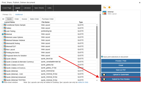 On the Print Window a “Submit for Peer Review” button is available. Click on it to Submit the current open document for peer review.
