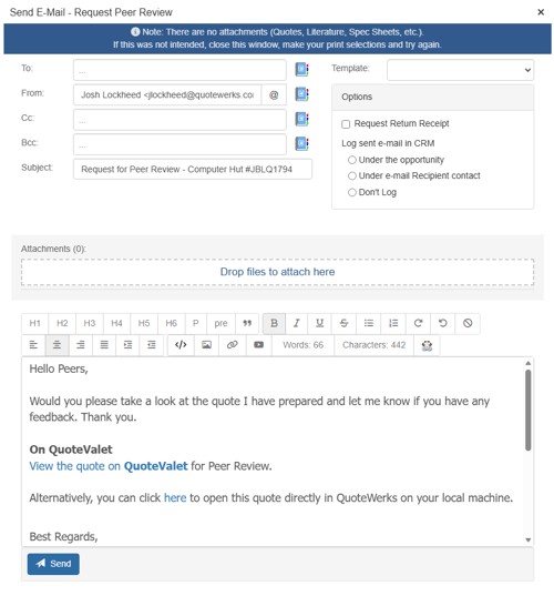 The “Submit for Peer Review” button will launch the built-in email client in QuoteWerks and populate the email with a message that the document is ready for review.
