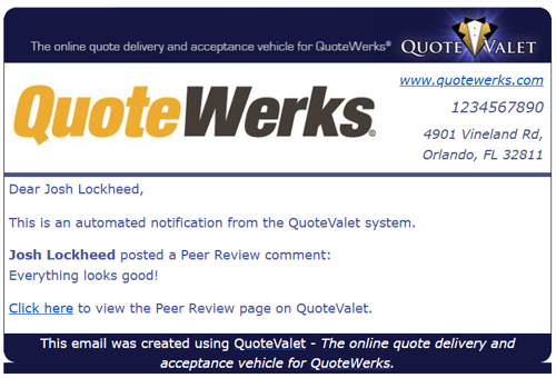 In this case, an e-mail is sent to your peers. There's a link in the e-mail that, when clicked, will open the quote on www.quotevalet.com. On this Web page, reviewers will be able to review the quote and submit their feedback. In this scenario, the machine the reviewer uses to access the quote doesn't need access to QuoteWerks.