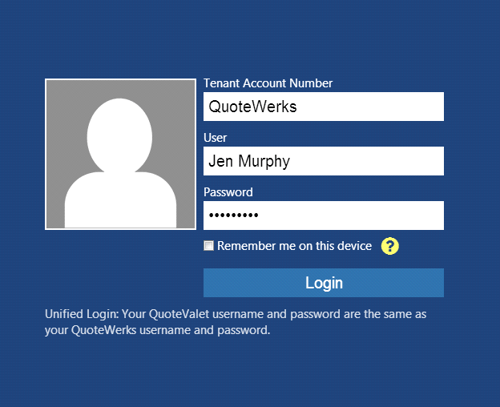 This will open the QuoteValet Insight login page. Type your QuoteValet Tenant Account Number, then your QuoteWerks Username and Password (the same information you use to log into QuoteWerks) into the corresponding fields and click Login.