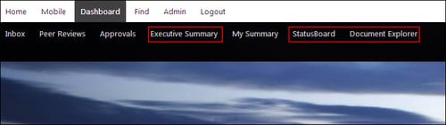 The Dashboard menu includes four options by default: Inbox, Peer Reviews, Approvals, and My Summary.