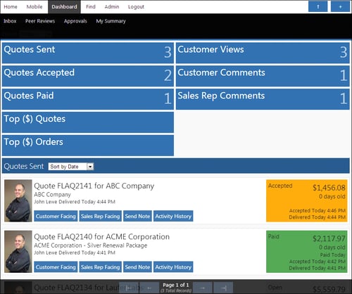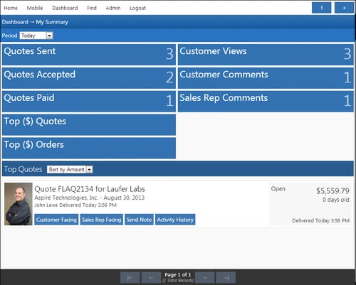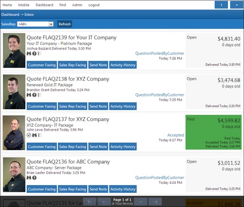 The Inbox under the Dashboard lets you view document activity. You can even view inbox activity for each sales rep if you have security rights to view their quotes, orders and invoices. This is the same inbox available in QuoteWerks by clicking QuoteValet on the main toolbar.