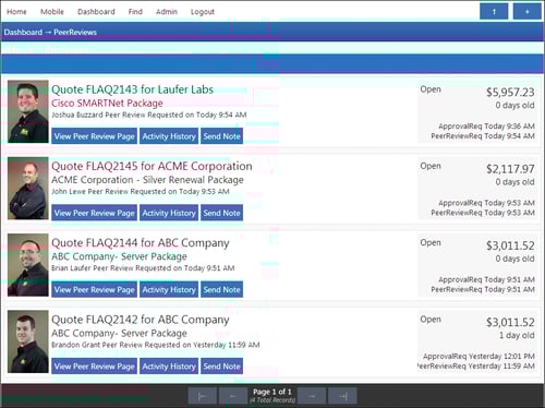 The Peer Reviews option under the Dashboard allows you to view documents that are currently being reviewed. From this screen, click View Peer Review Page to collaborate: make comments, view activity history, or send a note to the corresponding rep about the document.