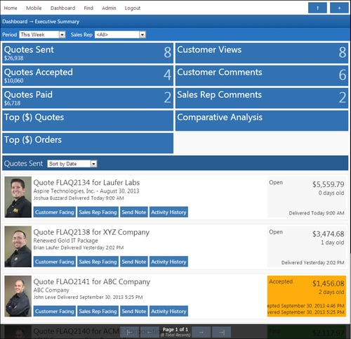 The Executive Summary provides an overview of open quotes and orders submitted through QuoteValet. Quickly see how many quotes have been sent, accepted, and paid for; how many customer views are on the quotes; and how many customer and sales-rep comments have been left, as well as do a Comparative Analysis.