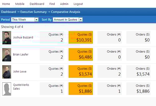 The Comparative Analysis allows sales managers/admins to view the number and dollar amounts of quotes and orders by sales rep. This view can be adjusted by timeframe from the Period drop-down box, including Today, Yesterday, This Week, Last Week, This Month, Last Month, Two Months Ago, This Year, and Last Year.
