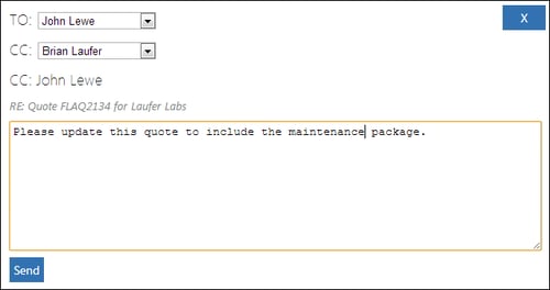 - Send Note (shown below): Launches a note that enables you to send a comment to other QuoteWerks sales reps about that particular document. You can also CC users on the document, and a copy will automatically be sent to the you (the initiator).