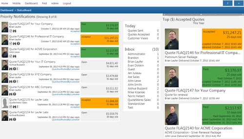 Additionally, StatusBoard includes a rotating panel on the right-hand side called the Leaderboard. This displays the top-dollar accepted quotes this week, month, and year, as well as the top-dollar outstanding quotes this week, month, and year.