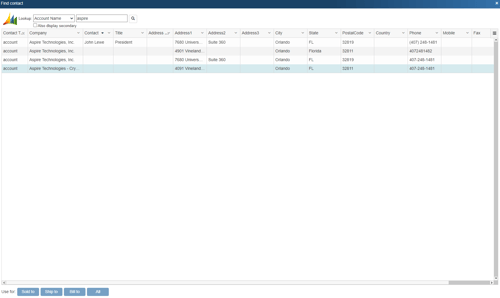 Once you have found the account or contact you are looking for, select the contact and click on the [Sold To] button to use this contact for the Sold to information. You can also select a contact and click on the [Ship To] button to use this contact for the Ship to information or you can click on the [Bill To] button to use this contact for the Bill to information. When you are finished selecting contacts, click on the [Close] button. You will be returned to the Sold to/ Ship to tab and the selected contacts will be pre-filled in the Sold to/Ship to/Bill to fields.