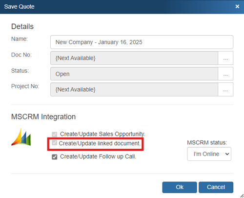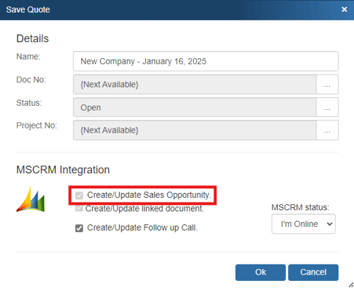 This option is only available when converting a quote to an ORDER or INVOICE. This option will create a completed opportunity in MS CRM under the Sales tab.