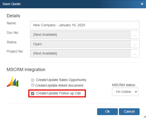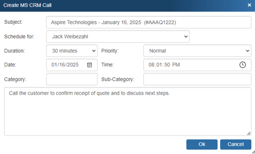 Select this to schedule a call in MS CRM so that MS CRM will remind you when you need to follow up on this quote.