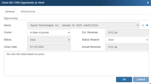 This completed sale can originate in several ways. First, if there is an existing sales opportunity for this quote, QuoteWerks will convert that existing sales opportunity into a ‘Closed as Won’ sale. If there is no existing sales opportunity and this option is checked, then QuoteWerks will create a new ‘Closed as Won’ sale. If the ‘Closed as Won’ sale already exists and you have made some changes to the order/invoice, unfortunately, QuoteWerks will not update the ‘Closed as Won’ sale in MS CRM unless you previously re-opened the opportunity in MS CRM.