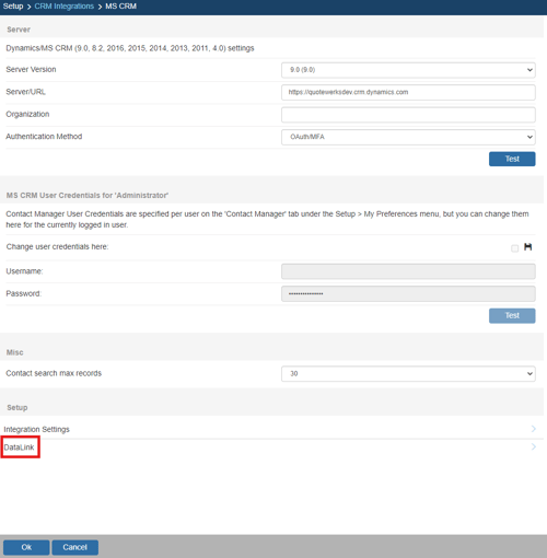 To setup the DataLink, click on Contacts-> Setup Contact Manager menu selection. Click on MS CRM then click on the [DataLink] button towards the bottom of the window.