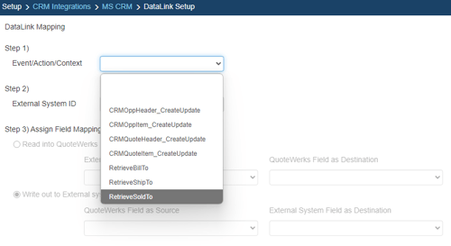Step 2: On the next window (DataLink Mapping), change the first drop-down menu to RetrieveSoldTo, RetrieveShipTo, or RetrieveBillTo. Your selection here will determine when the field from MS CRM is pulled into QuoteWerks (i.e. the filed data is pulled in when pulling the contact details into the Sold to, Ship to, or Bill to fields or when creating/updating the Opportunity).