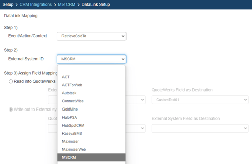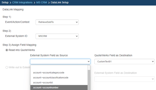 Step 5: The drop down for External System Field as Source will list the fields available from MSCRM. Select the field you would like to pull into QuoteWerks.