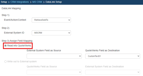 Step 4: On the next field of Assign Field Mapping click on the radial button for Read into QuoteWerks.