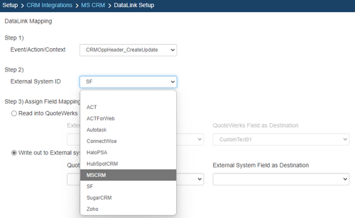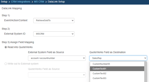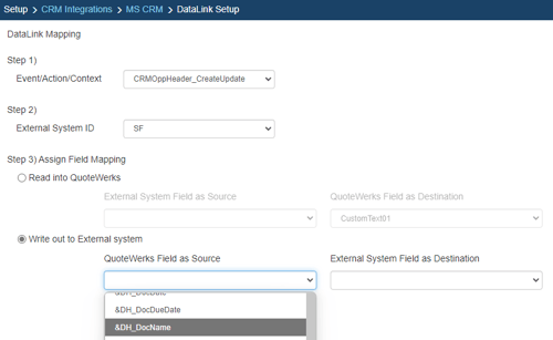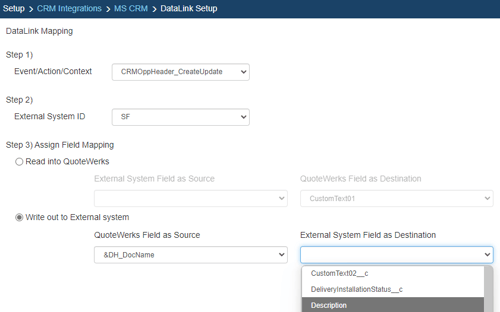 Step 6: Once your External field as source is selected, choose the QuoteWerks field that you would like the data from MSCRM to populate in the QuoteWerks Field as a Destination.
