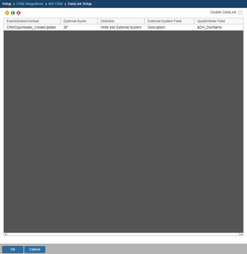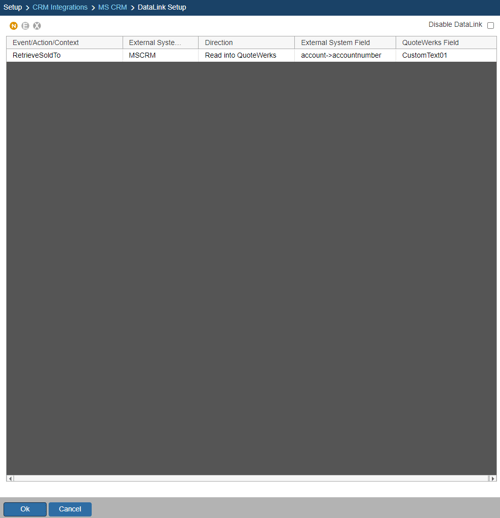 The DataLink feature allows you to pull or push additional data from specified fields in QuoteWerks and MS CRM. This data from MS CRM can be used to complete fields in the QuoteWerks document such as a customer profile, the tax rate, customer terms, custom fields, etc. for the customer. Additionally, by being able to push additional data into MS CRM Opportunities, users can also push additional information such as document number, document name, contract dates, and more.