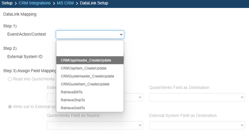 Step 2: On the next window (DataLink Mapping), change the first drop-down menu to CRMOppHeader_CreateUpdate to choose to push a DocumentHeader field from QuoteWerks to the MS CRM Opportunity or CRMOppItem_CreateUpdate to push item related information into MS CRM. This will also support the ability to push item details into the quote items created from QuoteWerks into the MS CRM quote.