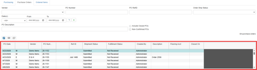 Once you have set your search criteria, a list of the matching open POs will become available under the Purchase Order panel along with their shipment status and fulfillment status.