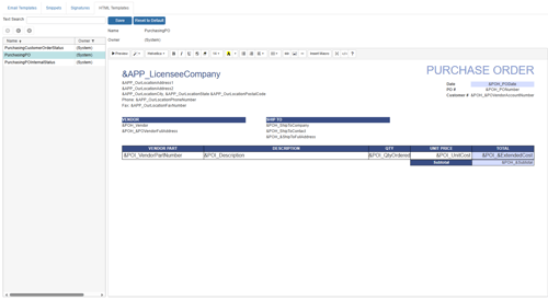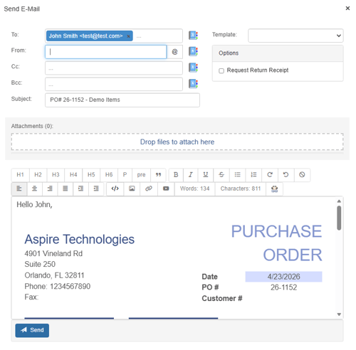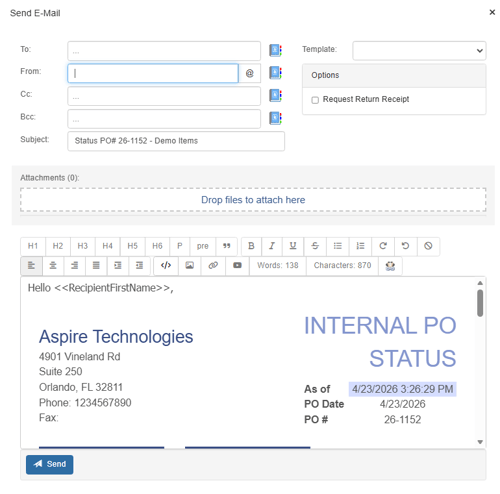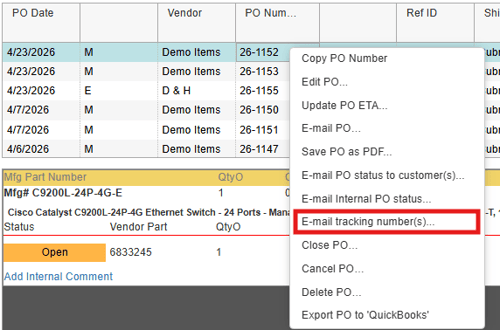 Right-clicking on a PO will also let users email the PO directly from the purchase order list, email an internal status, and email your customers an updated PO Status. These will generate an HTML formatted Purchase Order and pre-fill the Send Email window with it.