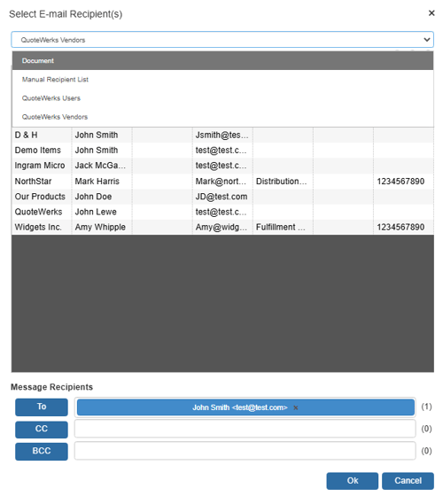 You can select from a list of Vendor email addresses on the quote or from all available Vendor email addresses in QuoteWerks by selecting the