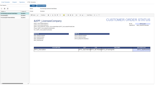 You can use this to email status information to your customers about the items ordered for them on the Purchase Order. The HTML template and email can be fully customized and including tracking and serial numbers. Since your Purchase Orders can contain items from different customers, this feature will send each of those customers status updates on only their items on the Purchase order related to them. There is also a grid toolbar button