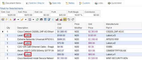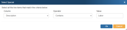 So, in the example above, the specified parameters will select all items that have the word "Labor" (Value) somewhere (Operator = "Contains") in their Description column: