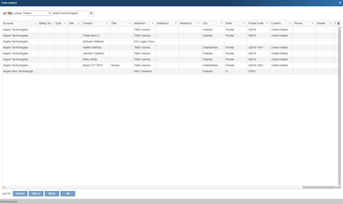 Once you have found the account or contact you are looking for, select the contact and click on the [Sold To] button to use this contact for the Sold to information. You can also select a contact and click on the [Ship To] button to use this contact for the Ship to information or you can click on the [Bill To] button to use this contact for the Bill to information or the [All] button to populate the same contact information across all three fields.