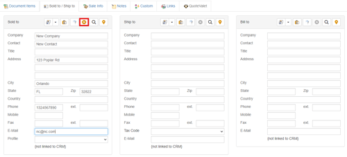 To create a new Company and Contact from the Sold to/Ship to tab, you will need to fill out the Company and Contact fields at a minimum. However, we recommend filling out all of the contact fields (title, address, email, phone, etc.) so all of this data is created in Zoho CRM for you. This will then activate the new contact button on the toolbar above the contact.