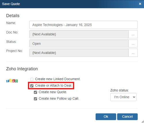 When you save a quote, the Create or Attach to Deal checkbox will appear on the Save window.