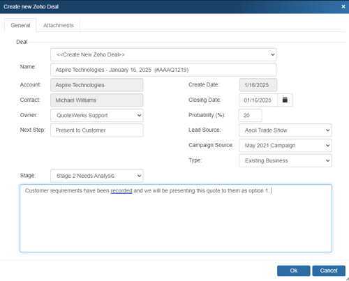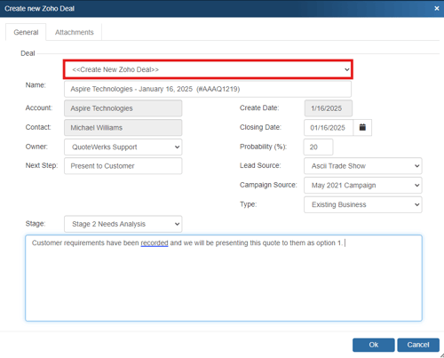 By creating Opportunities in Zoho from QuoteWerks, you allow QuoteWerks to help you build your sales pipeline. If you already have a Deal for this quote, it will automatically update the existing one to reflect changes you have made to the quote.