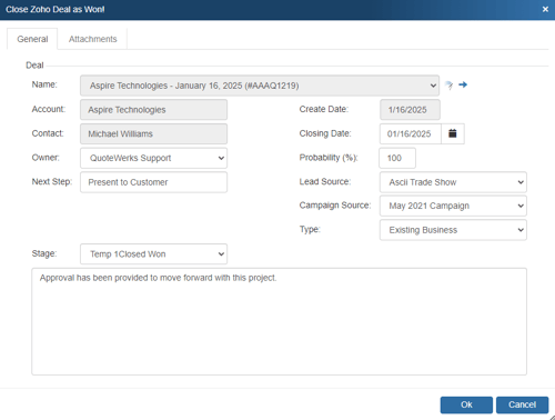 If the option to update Deals as won has been set in your installation, QuoteWerks will automatically update the Zoho Deal as won when converted to an order or invoice (based on your settings) when using the File -> Convert to Order menu option.