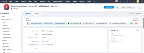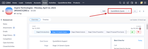 If you have an existing deal that was created within Zoho CRM, you can initiate a new quote for this deal by clicking on the “QuoteWerks Quote” button.