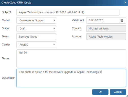 Once you have pressed the [OK] button from the "Create or Attach to Deal" window, the “Create/Update Zoho Quote” window will appear, enabling you to create/update an Zoho CRM quote. The Quote Subject, Stage, Terms, Description, and Expiration Dates can all be modified before saving the quote in Zoho CRM.