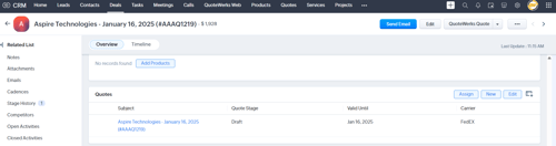 NOTE: If items on a QuoteWerks quote do not exist in Zoho CRM, when QuoteWerks creates the Zoho CRM Quote, the items will be created in the Zoho CRM database. If they do exist, they will not be overwritten. QuoteWerks matches the Zoho CRM Products using the mapping set up on the Deals tab.