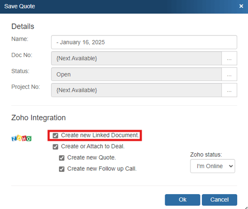 TIP: Unchecking the Create or Attach to Deal box will uncheck the Create or Update document Attachment box, since document attachments are only attached to the deal in Zoho. Otherwise, Zoho would automatically create a new deal to house the document attachment, which you don't want if Create or Attach to Deal is unchecked.