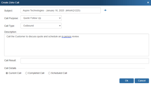 This window will set the subject to the name of the document and then let you set the call purpose, call type, add a description,, and a call result. You can also choose to mark it as a current, completed, or scheduled call.