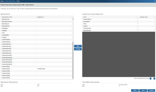 Step 3: This window allows you to map the ZohoCRM item fields to their QuoteWerks counterpart. By default, we have already mapped some of the ZohoCRM fields to QuoteWerks fields such as Description, Price, ProductName, and Product Code.