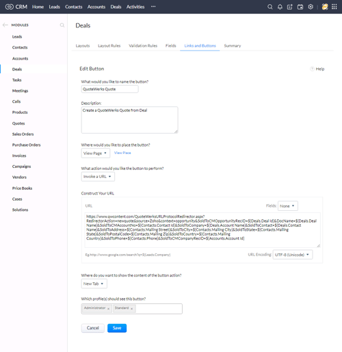 https://www.qwcontent.com/QuoteWerksURLProtocolRedirector.aspx?RedirectorAction=newquote&source=Zoho&context=opportunity&SoldToCMOpportunityRecID=${Deals.Deal Id}&DocName=${Deals.Deal Name}&SoldToCMCompanyRecID=${Accounts.Account Id}&SoldToCompany=${Deals.Account Name}&SoldToCMContactRecID=${Contacts.Contact Id}&SoldToContact=${Deals.Contact Name}&SoldToAddress=${Contacts.Mailing Street}&SoldToCity=${Contacts.Mailing City}&SoldToState=${Contacts.Mailing State}&SoldToPostalCode=${Contacts.Mailing Zip}&SoldToCountry=${Contacts.Mailing Country}&SoldToPhone=${Contacts.Phone}