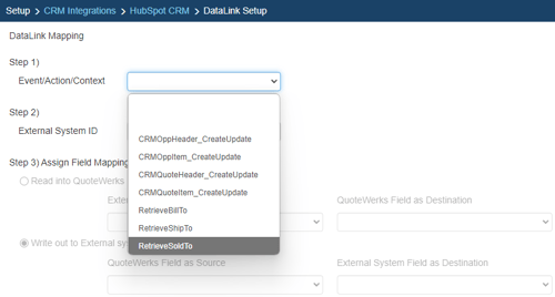Step 2: On the next window (DataLink Mapping), change the first drop-down menu to RetrieveSoldTo, RetrieveShipTo, or RetrieveBillTo. Your selection here will determine when the field from Zoho is pulled into QuoteWerks (i.e. the filed data is pulled in when pulling the contact details into the Sold to, Ship to, or Bill to fields).