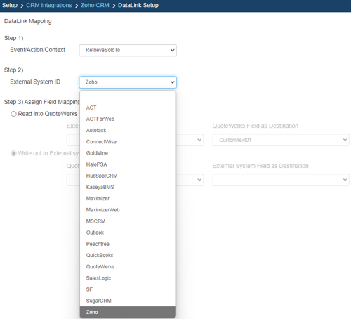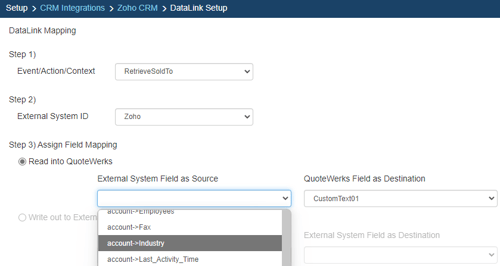 Step 6: Once your External field as source is selected, choose the QuoteWerks field that you would like the data from Zoho to populate in the QuoteWerks Field as a Destination.