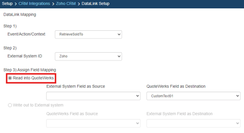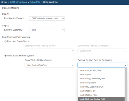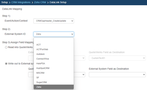 Step 6: Once you choose your QuoteWerks field to write out, choose the Zoho destination field that you would like the data from QuoteWerks to populate in the External System Field as Destination.
