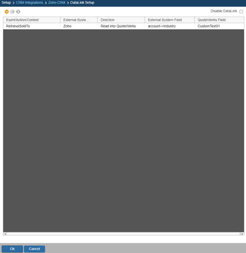 The DataLink feature allows you to pull additional information from fields in Zoho when retrieving the contact information. This data from Zoho can be used to complete fields in the QuoteWerks document such as a customer profile, the tax rate, customer terms, custom fields, etc. for the customer. Clicking on the [DataLink] button on the Contact Manager Setup window will display the DataLink setup window.